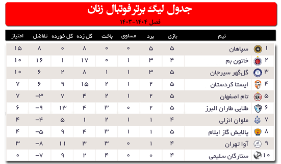 هفته پنجم لیگ برتر فوتبال زنان در شرایطی به پایان رسید که سپاهان مقتدرانه و با کسب 15 امتیاز صدرنشین است، خاتون بم با کسب 10 امتیاز از 4 مسابقه و انجام یک بازی کمتر نسبت به سایر مدعیان، با تفاضل 16+ در رتبه دوم حضور دارد، گل‌گهر سیرجان با 10 امتیاز و تفاضل 6+ در جایگاه سوم است و ایستا کردستان هم با 7 امتیاز در رتبه چهارم حضور دارد. مسابقات هفته ششم لیگ برتر فوتبال زنان پنج‌شنبه هفته آینده (اول آذرماه) پیگیری می‌شود که سپاهان در کرج میهمان طاران البرز است، خاتون بم در خانه باید به مصاف نماینده بوشهر برود و در دوئلی حساس، ایستا کردستان پذیرای گل‌گهر سیرجان خواهد بود.