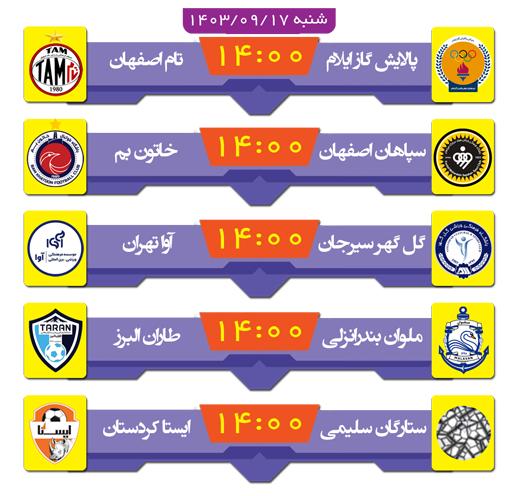 گلگهر سیرجان که با 11 امتیاز در رتبه سوم قرار دارد، این هفته میهمان تیم آوا تهران است که از 18 امتیاز ممکن در فصل جدید فقط 3 امتیاز بهدست آورده و در رتبه ماقبل پایانی است. ایستا کردستان در بوشهر میهمان نماینده این استان است که به نظر میرسد شاگردان مریم ایراندوست مقابل تیم قعرنشین و بدون امتیاز جدول کار آسانی داشته باشند. ملوان بندرانزلی هم باید در خانه به مصاف طاران البرز برود که شاگردان پگاه نوری امیدوارند بتوانند سومین برد پیاپی خود را در فصل جاری جشن بگیرند و موقعیت ملوان در بین مدعیان را تثبیت کنند. گفتنی است که دو تیم پالایش گاز ایلام و تام اصفهان هم رودرروی هم قرار خواهند گرفت.