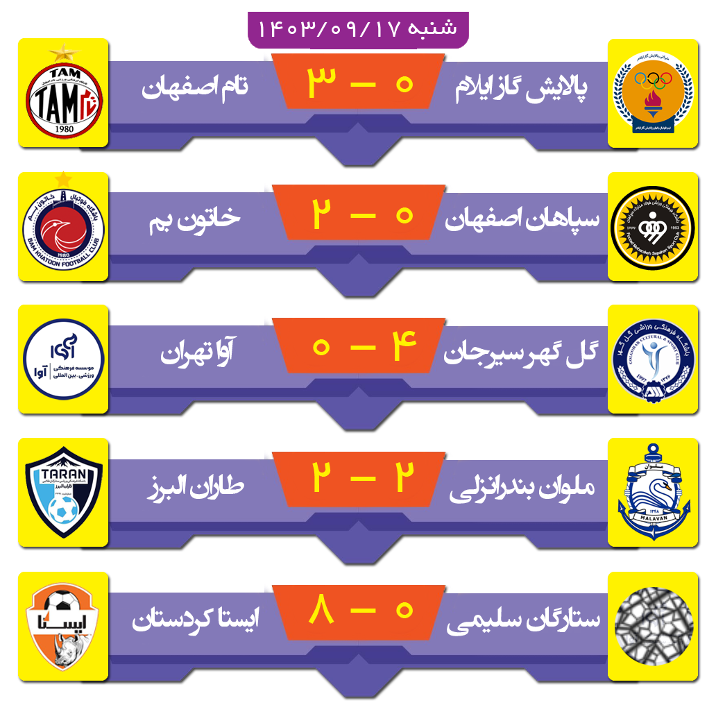 سرمهایپوشان سیرجانی بعد از کسب 3 برد، پذیرش 2 تساوی و تحمل یک باخت امروز میزبان آوا تهران بودند که گلگهریها توانستند حریف خود را با 4 گل در هم بکوبند و شمار امتیازات خود در فصل جاری را به عدد 14 رساندند تا در کورس قهرمانی در رتبه سوم موقعیتشان را تثبیت کنند. ایستا کردستان هم جشنوارهای از گل به راه انداخت و برابر تیم قعرنشین نماینده بوشهر بردی 8گله را بهدست آورد تا شمار امتیازات این تیم در جدول به عدد 11 برسد. در سایر دیدارها، تام اصفهان با نتیجه 3 بر صفر از سد پالایش گاز ایلام گذشت تا با 10 امتیاز به رتبه پنجم صعود کند و مصاف ملوان بندرانزلی با طاران البرز هم در حال برگزاری است.