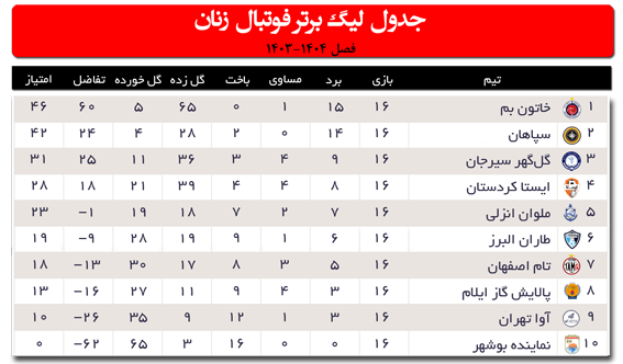 خاتون بم با 46 امتیاز صدرنشین است، سپاهان اصفهان با 42 امتیاز در جایگاه دوم قرار دارد، گل گهر سیرجان با 31 امتیاز در رده سوم جدول است و ایستا کردستان با 28 امتیاز در جایگاه چهارم قرار دارد.