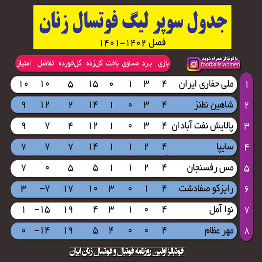 در پایان هفته چهارم رقابت‌ها، ملی‌حفاری اهواز با 10 امتیاز صدرنشین رقابت‌ها است و شاهین نطنز با 9 امتیاز و تفاضل 12+ در جایگاه دوم قرار دارد و پالایش‎‌نفت آبادان هم با 9 امتیاز و تفاضل 7+ سومین تیم برتر جدول رده‌بندی است. تیم‌های سایپا تهران و مس رفسنجان هم با 7 امتیاز در رتبه‌های چهارم و پنجم قرار دارند. هفته پنجم سوپرلیگ فوتسال زنان ایران روز پنجشنبه دوم آذرماه پیگیری خواهد شد که در مهم‌ترین دیدارها، شاهین نطنز در خانه پذیرای سایپا تهرن خواهد بود و ملی‌حفاری اهواز باید در دیداری خانگی برابر مس رفسنجان قرار گیرد.