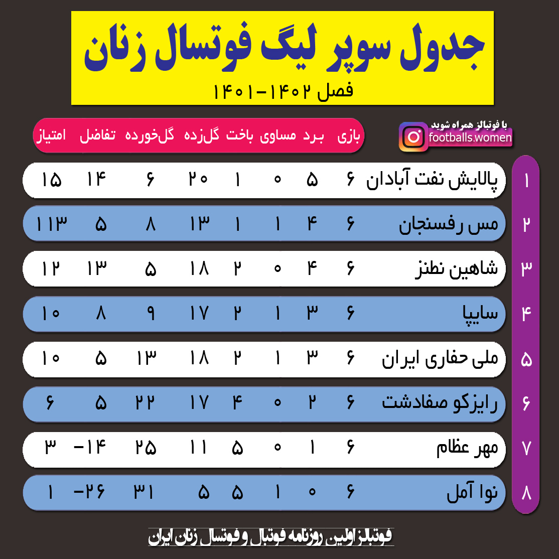 به گزارش فوتبالز نیم‌فصل نخست سوپرلیگ فوتسال زنان ایران هفته آینده به پایان کار خود می‌رسد و امروز (پنجشنبه) در هفته ماقبل پایانی نیم‌فصل اول، 2 مسابقه از حساس‌ترین و مهم‌ترین تقابل‌های فصل در تهران و نطنز به انجام رسید. تا پیش از آنکه مسابقه امروز آغاز شود، پالایش‌نفت آبادان با 12 امتیاز صدرنشین رقابت‌ها بود و سایپا تهران، ملی‌حفاری اهواز و مس رفسنجان هم با 10 امتیاز در رتبه‌های دوم تا چهارم حضور داشتند و شاهین نطنز هم با 9 امتیاز تیم پنجم جدول رده‌بندی بود.