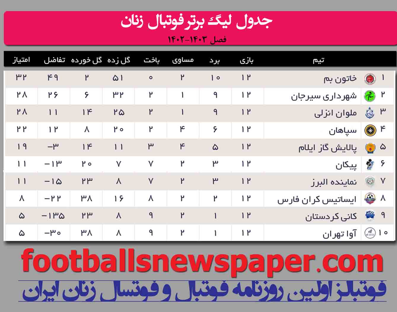 خاتون بم در پایان هفته دوازدهم با کسب 32 امتیاز همچنان صدرنشین جدول ردهبندی است و تیمهای شهرداری سیرجان و ملوان بندرانزلی هم با 28 امتیاز در رتبههای دوم وسوم حضور دارند؛ آنهم در حالیکه تفاضل گل شهرداری سیرجان 26+ است و ملوانیها با تفاضل 11+ کار خود را پیش میبرند. البته که در صورت برابری امتیازات تا پایان فصل، به دلیل وضع قانون نتایج بازی رودررو، ملوان در جایگاهی بالاتر از شهرداری سیرجان قرار خواهد گرفت. سپاهان اصفهان هم با 22 امتیاز در جایگاه چهارم نامش به چشم میخورد و پالایش گاز ایلام هم با 19 امتیاز در رتبه پنجم جدول حضور دارد.