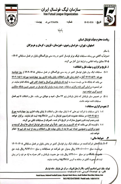 دستورالعمل برگزاری مسابقات لیگ برتر فوتسال زنان