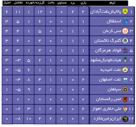 استقلال تهران هم با ۳ امتیاز و یک بازی کمتر و تفاضل گل بهتر در جایگاه دوم قرار دارد.
