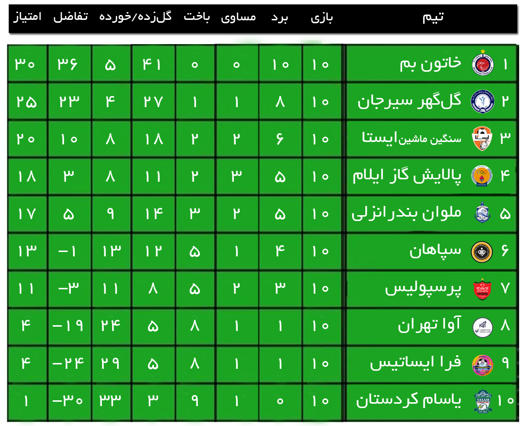 نتایج هفته دهم لیگ برتر فوتبال زنان به شرح زیر است: