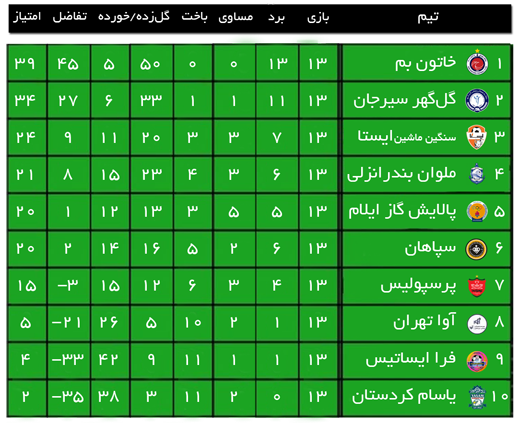 خاتون بم با ثبت 13 برد در 13 مسابقه و کسب 39 امتیاز، مقتدرانه صدرنشین جدول لیگ برتر زنان است و پس از این تیم، گل‌گهر سیرجان با 34 امتیاز در رتبه دوم نامش به چشم می‌خورد. ایستا البرز با 24 امتیاز در جایگاه سوم قرار دارد، زنان ملوان بندرانزلی 21 امتیازی در رتبه چهارم هستند و پالایش گاز ایلام هم با 20 امتیاز به دلیل برد در بازی رودررو با سپاهان بالاتر از این تیم در جایگاه پنجم نامش دیده می‌شود. تیم زنان پرسپولیس هم با 15 امتیاز در رتبه هفتم جدول حضور دارد و کاملاً از صف تیم‌های بالانشین دور شده است. هفته چهاردهم لیگ برتر زنان در حالی جمعه هفته آینده (نوزدهم دی‌ماه) پیگیری می‌شود که همه نگاه‌ها به سوی ورزشگاه فجر بم و جدال حساس خاتون – گل‌گهر است. ضمن آنکه در دیگر بازی حساس هفته، پرسپولیس در تهران میزبان سپاهان اصفهان خواهد بود.